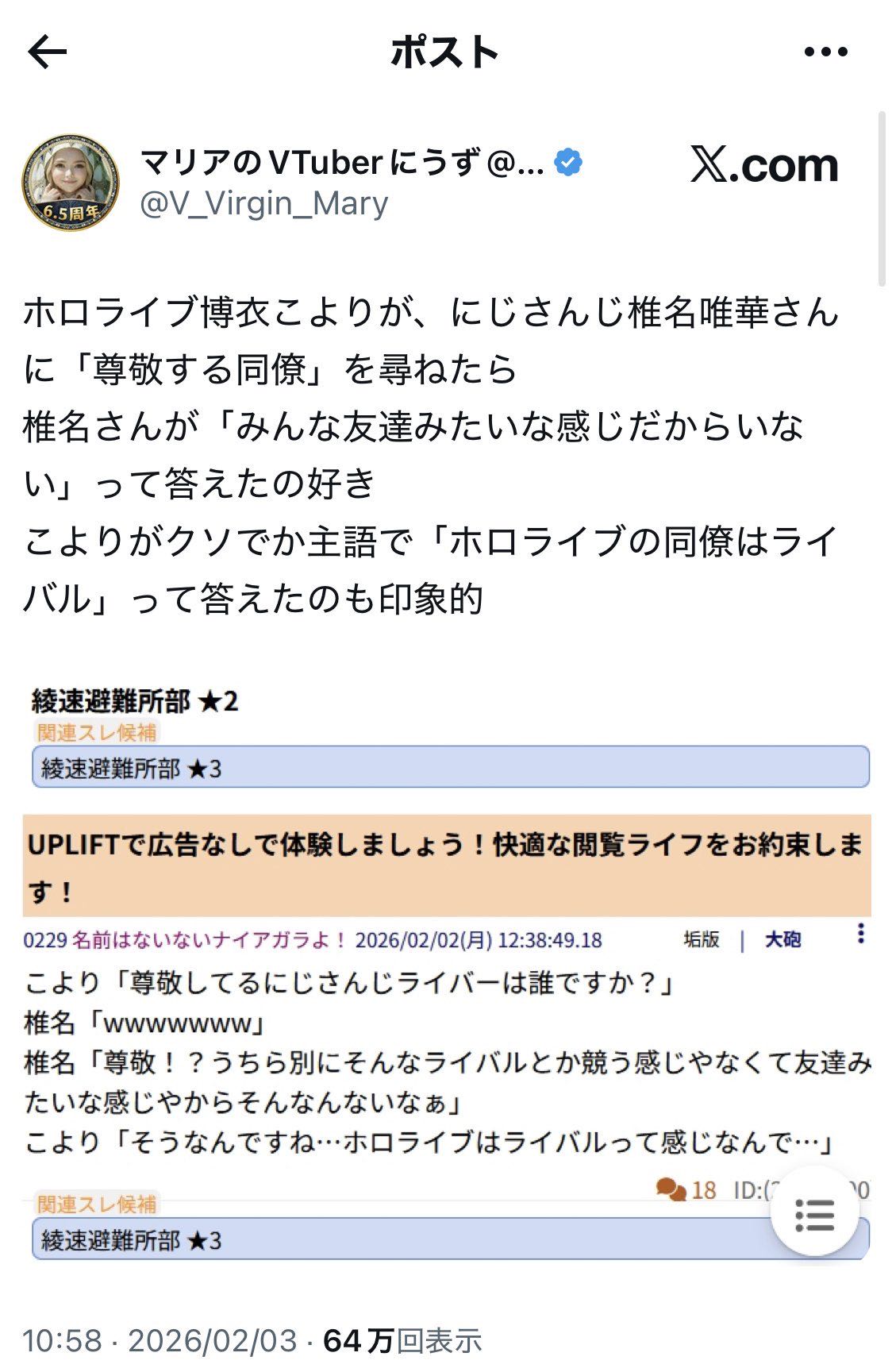 | … | 8626/02/04(水)19:21:42 ID:QyOcOECoNo.1398784036そうだねx4>にじアンとホロアンの根幹が繋がってるからよ |