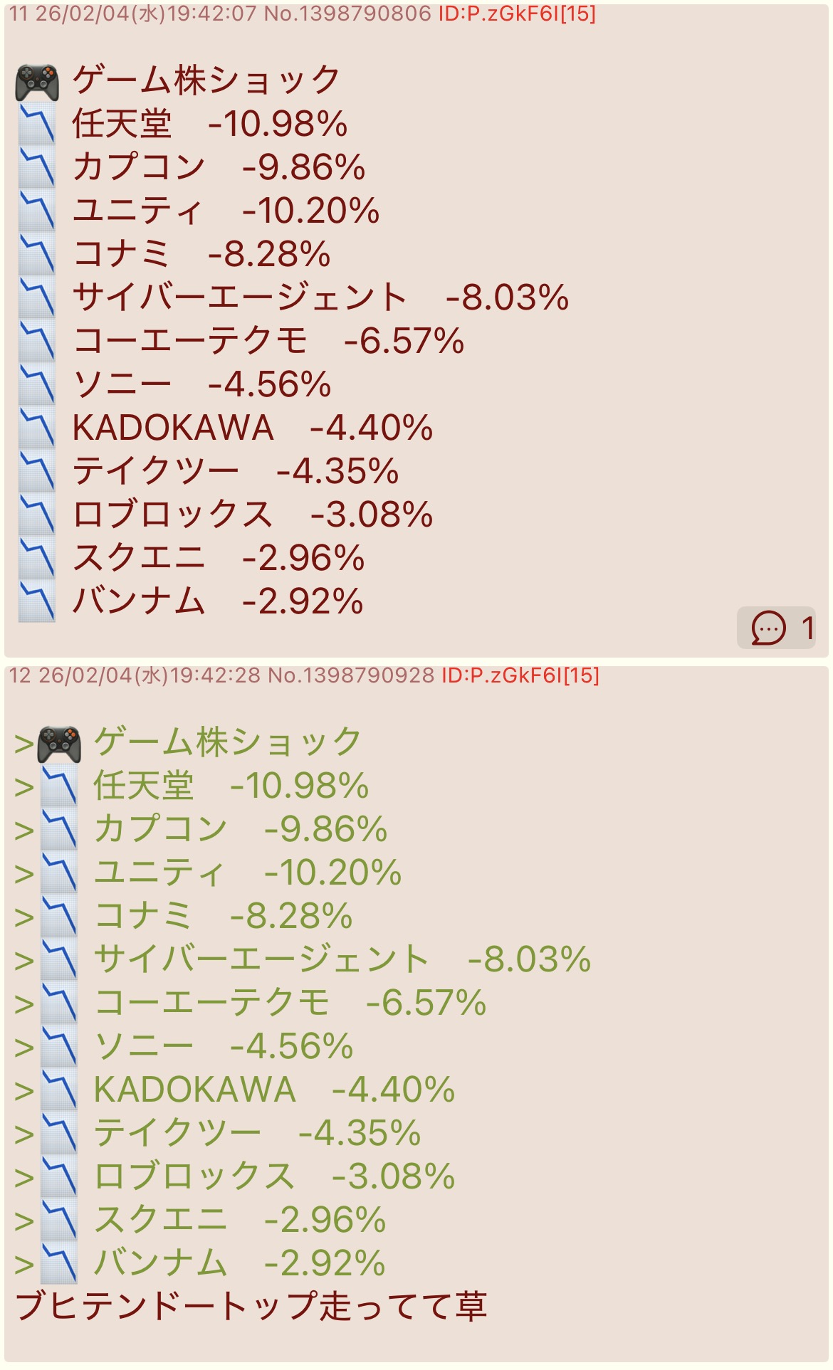 | … | 21826/02/04(水)20:13:54No.1398801594そうだねx1まぁ任天堂上げてる方も株の話はわからないので… |