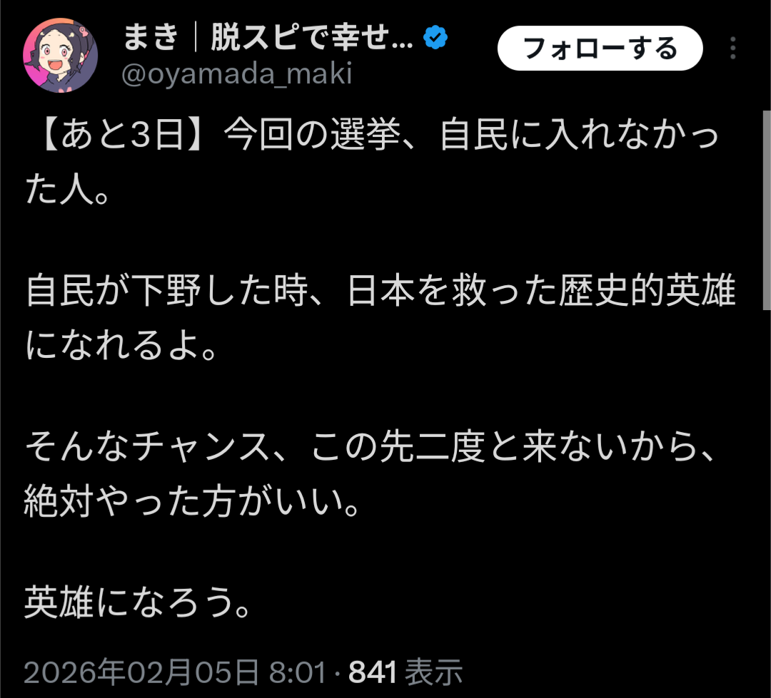 | … | 2026/02/05(木)11:04:55No.1398953252+>脱スピして選挙にハマったのか |
