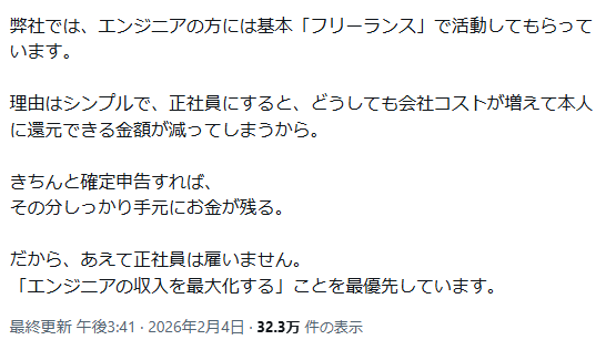 | … | 126/02/05(木)14:02:40No.1398993199そうだねx24エンジニアへの支払額自体は正社員より大きくなるかもしれないけど正社員なら会社で諸々やって貰える分自分でやるとむしろマイナスになるとかそういうやつ…? |