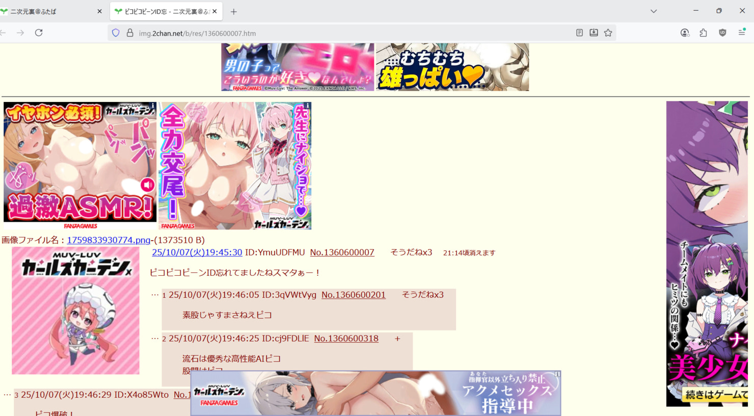 | … | 6126/02/05(木)19:28:08No.1399068375+>>けっこうユニークな広告が多くて面白いねぇ! >imgでも割と広告出るのかャ? みんな消してるけどえっちなゲームャってるとよく出るんャ |