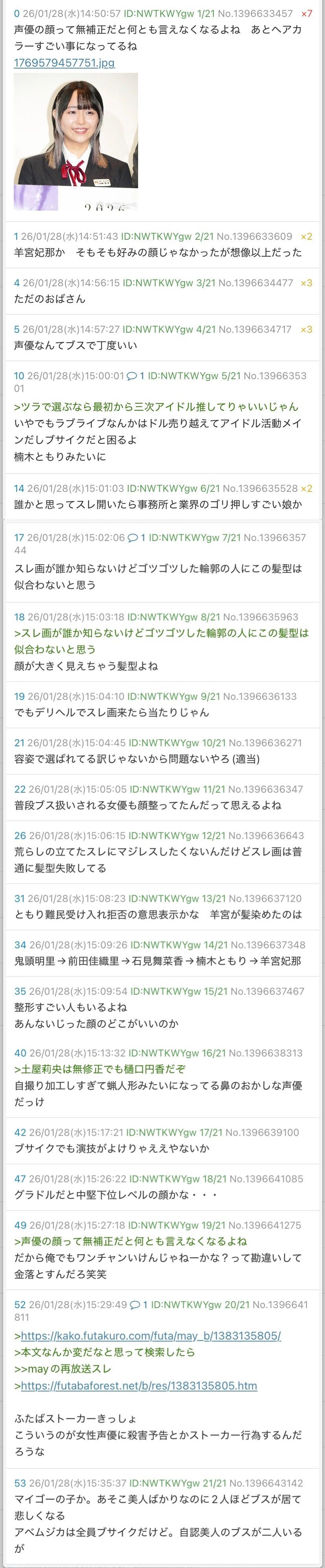 | … | 7626/02/06(金)01:37:12No.1399198405+女性声優に粘着してるからおばさんかと思ってた |