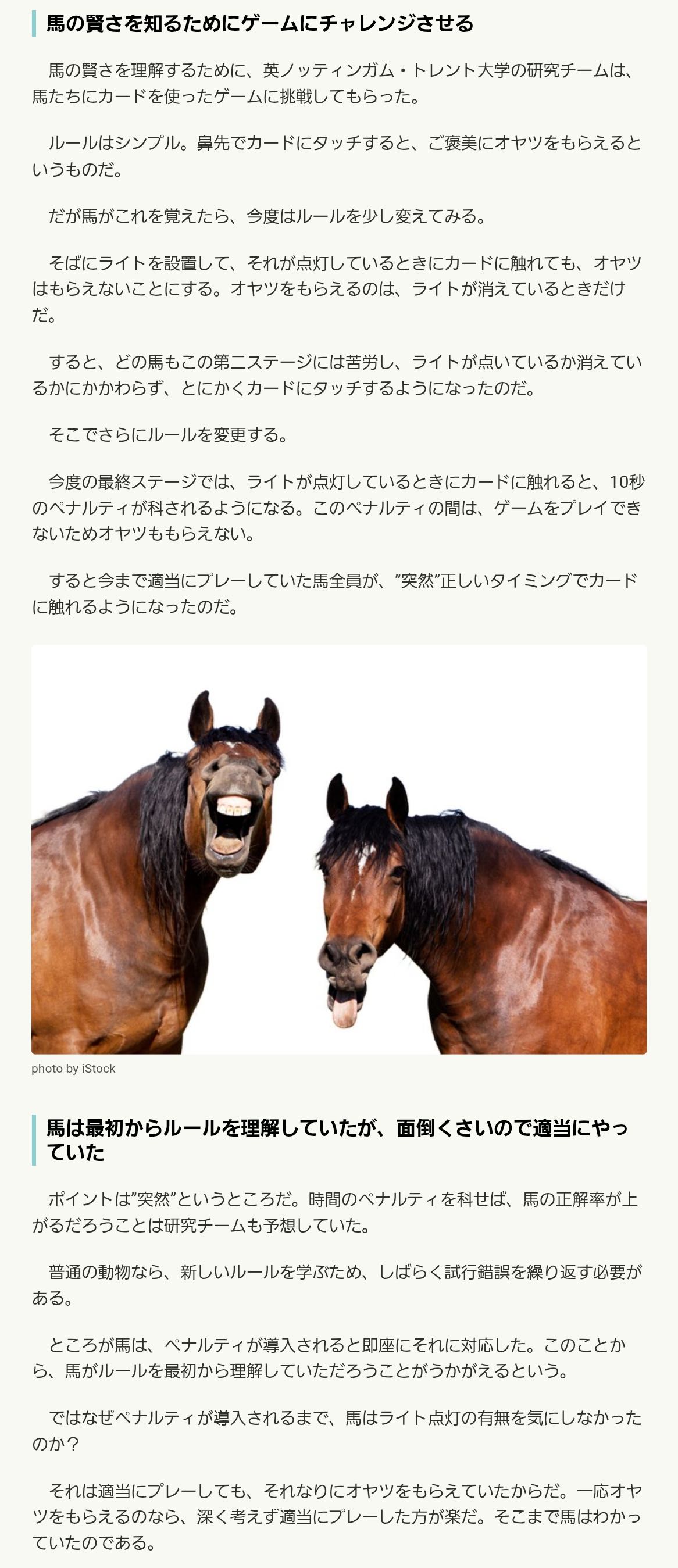 | … | 19926/02/06(金)10:36:31No.1399246784そうだねx3こういう実験見ると現実の馬って賢い怠け者タイプだと思う |