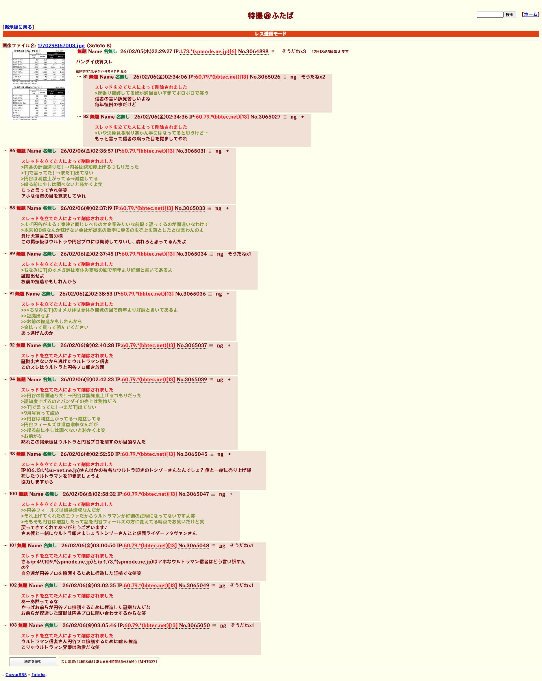 | … | 2526/02/06(金)13:30:23No.1399294015そうだねx5スレ立てたけどシングルタスクで忙しいのバレバレ |