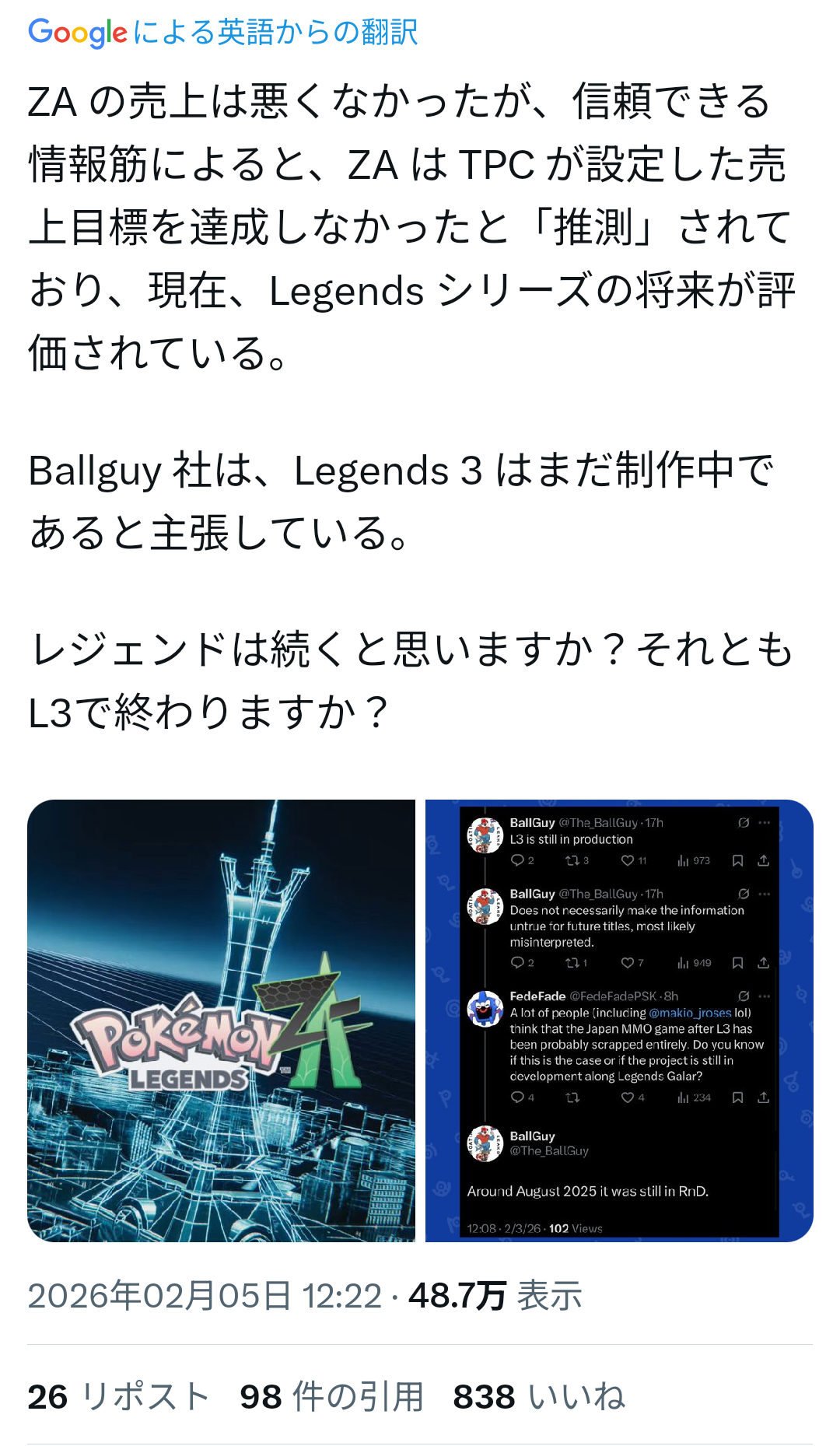 | … | 826/02/06(金)18:38:37No.1399361507そうだねx6レジェンズ3は開発中止で本家チームに開発は合流する流れになるかもしれんな… |