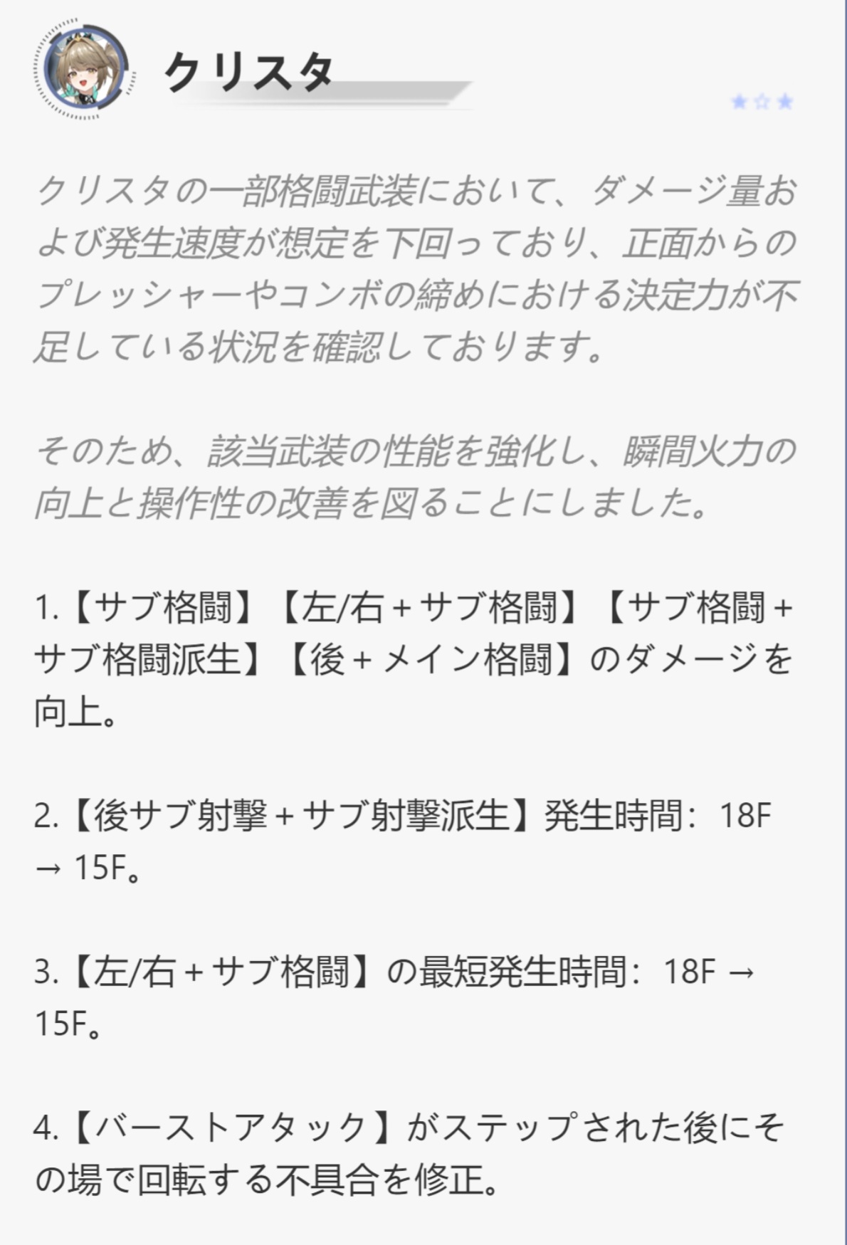 | … | 426/02/06(金)19:30:16No.1399378537+クリスタちゃんこれ…横サブ格はメンテ前の性能に戻されたうんち? |