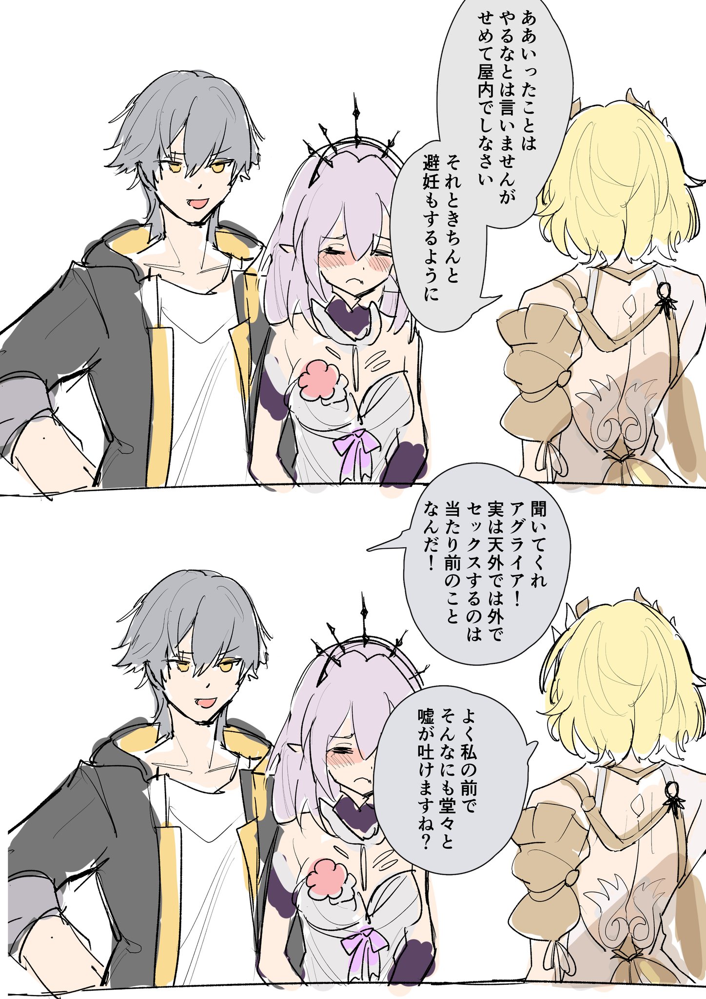 | … | 10726/02/06(金)21:53:42No.1399433453+>ヴィタも!それにヴェルトさんも! >こんなにみんなが心配してるのに、なんで他所の宇宙で遊んでるわけ!? >あんたたちが責任をちゃんと果たしてくれてたら、セナディアだって…… おお〜無能なヘリアちゃん 僕とヴェルトさんの辞書にはそもそも『責任』なんて言葉は存在しないよ〜 |