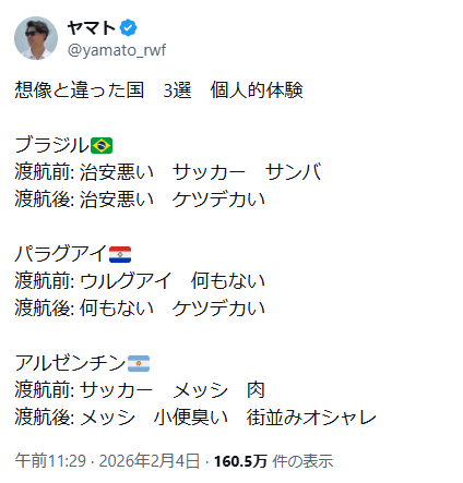 | … | 826/02/07(土)08:32:54No.1399537550+アルゼンチンは元先進国なだけはあるな |