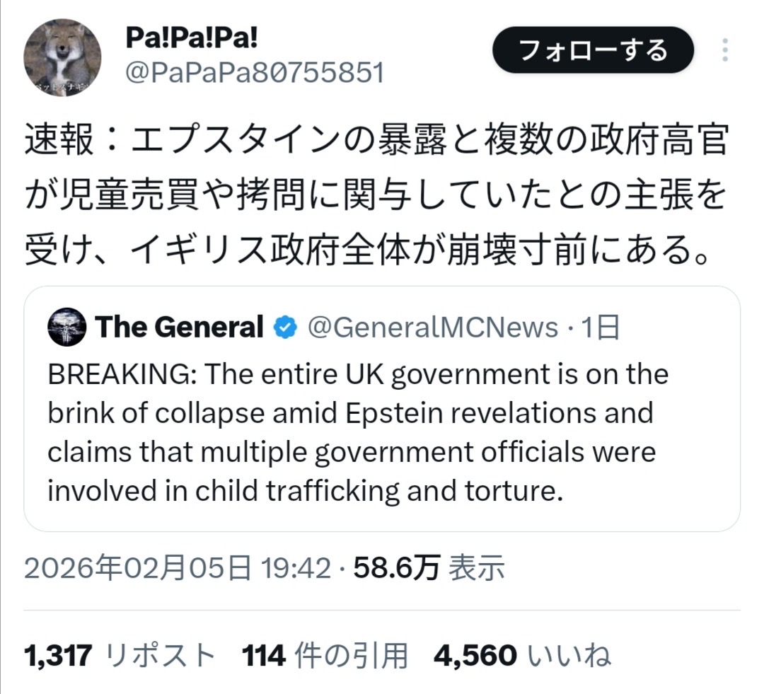| … | 2926/02/07(土)17:04:26No.1399663068そうだねx10名前が出ちゃった労働党の大物は国家機密売り渡してたからロリ犯罪抜きでも普通に国賊で笑う |