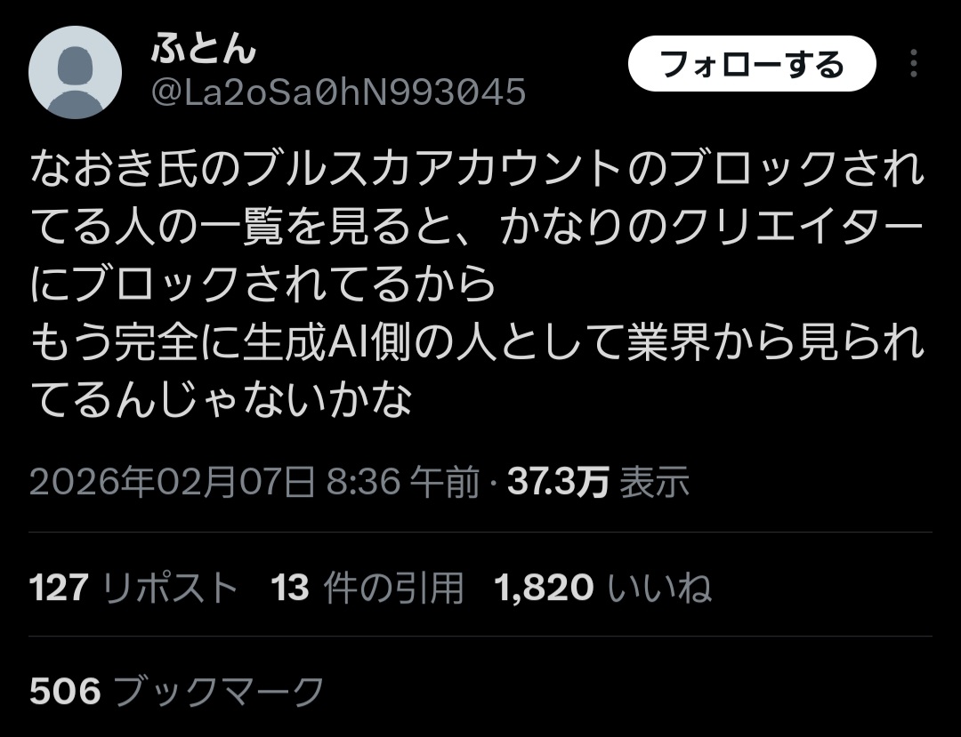 | … | 726/02/07(土)18:03:15No.1399679167そうだねx8「さいとうなおきって生成AI側の人だからブロックしてやろう〜」(煽り顔) |