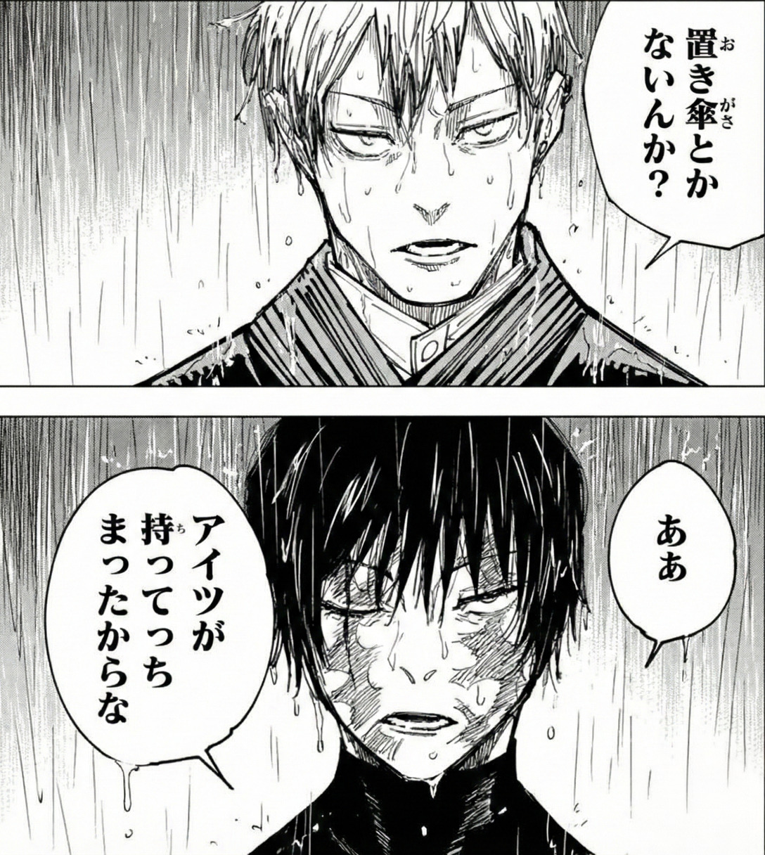 | … | 43126/02/07(土)21:59:15No.1399769802そうだねx2…伏黒恵が買ってた傘だろう |