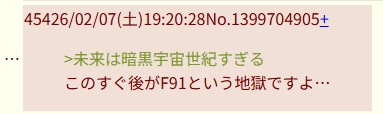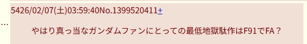 | … | 47426/02/07(土)21:21:26No.1399753522そうだねx5>F91は地獄の世界になってるんだよな |