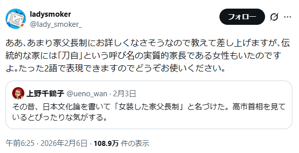 | … | 3326/02/08(日)01:30:48No.1399850319+主張の内容はどうでもいいけど「女装した家父長制」はなんとなく門外漢であっても意味がわかるけど「刀自」つっても元々分かってる人にしか分かんねーだろ |