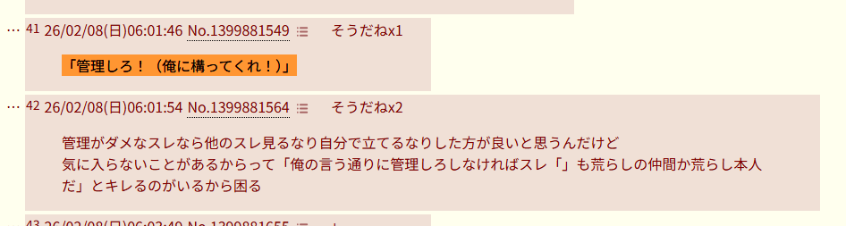 | … | 126/02/08(日)06:20:45No.1399882503そうだねx1管理がダメなスレなら他のスレ見るなり自分で立てるなりした方が良いと思うんだけど |