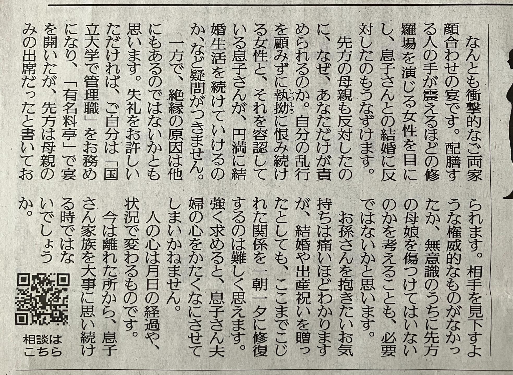 | … | 30926/02/08(日)10:28:52No.1399931696+>旦那を引き取る相談者側と嫁と孫を引き取る義母側で結婚取りやめに対する重みが同じだと思える点ある? |