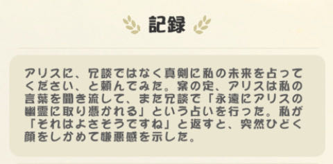 | … | 3026/02/08(日)10:19:22 ID:2W/F35uwNo.1399929322そうだねx5>fu6269153.jpg >これ定型にして欲しいにゃん アリスにいたずらではなく、真剣に私の将来を占ってくれと頼んだ。案の定、アリスは私の言葉を聞き流して、またいたずらで「一生アリスに取り憑かれて暮らす」という占いを出したが、私が「悪くないと思う」と言い返すと、急に顔全体をしかめて嫌悪に満ちた表情を浮かべた。