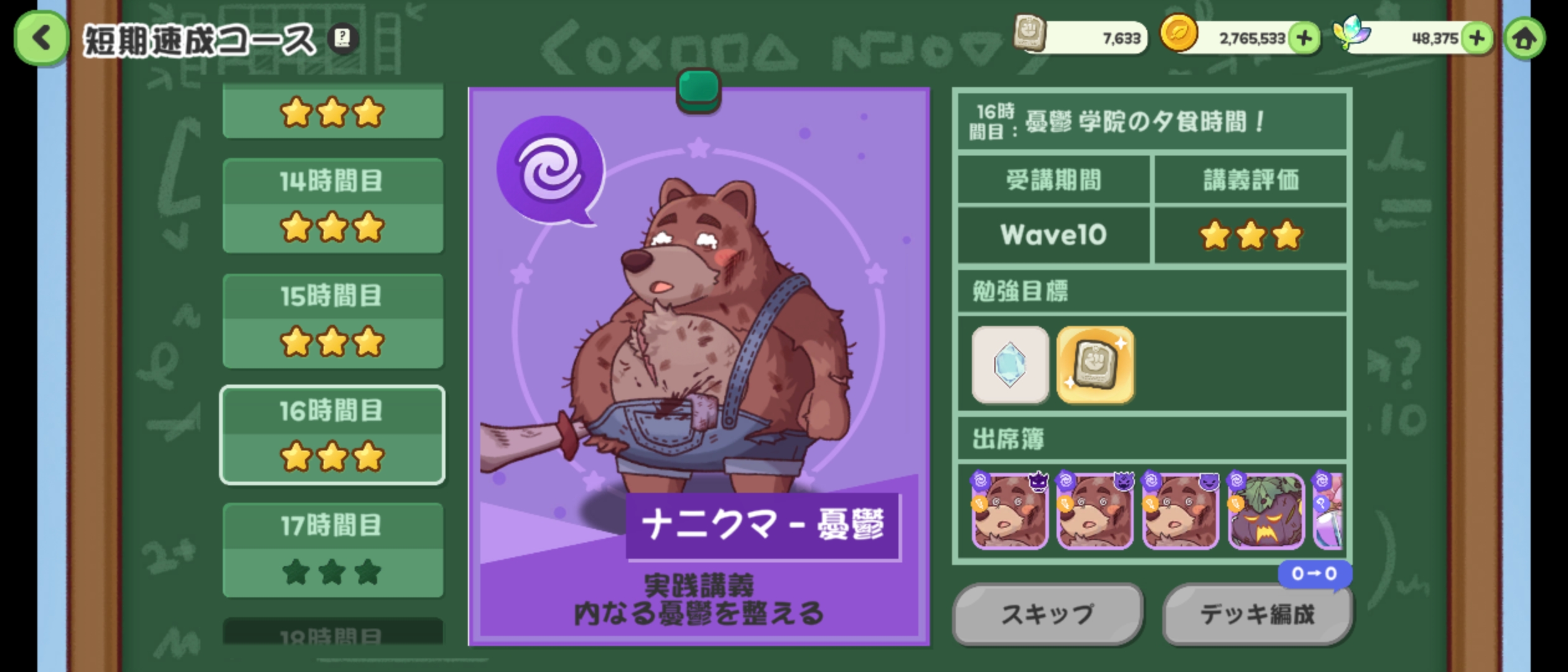 | … | 1726/02/08(日)10:15:59 ID:c29v3L76No.1399928481+活発と憂鬱が11時間目で★1になったにゃん ついに短期速成もスキップにゃんね… |