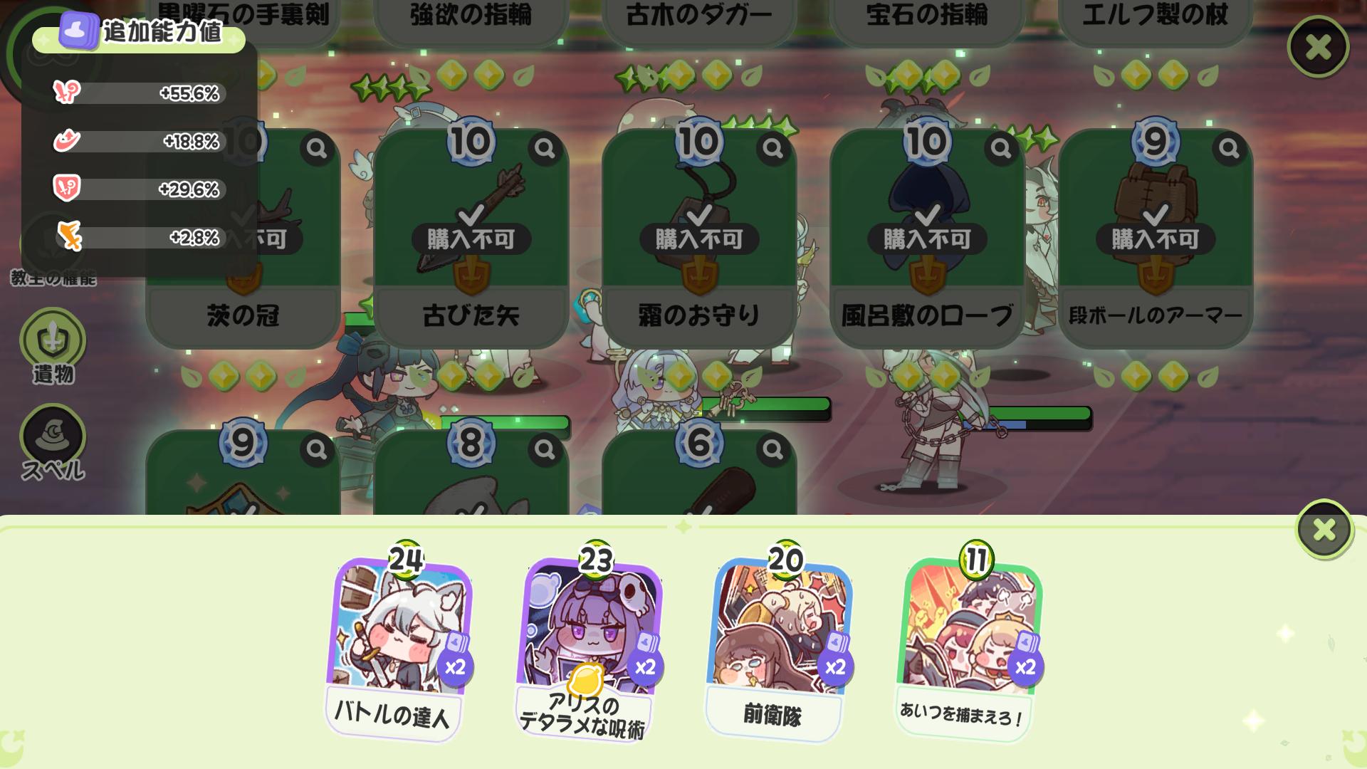| … | 34026/02/08(日)11:55:15 ID:oES9Dhe.No.1399951758+>>10は…ヌルゲーしつつ前衛を砥石とかでカチカチにして行けた記憶があるにゃん >>11はモモで12もモモしたにゃん >>ソーダx2とモモに聖杯とペンダントを付けるにゃん >>スペカアリス添えて盤石の構えにしてもいいにゃん >砥石ヴィヴィ棒ライフジェム積んでもコミーがワンパンなんだね。 >全8装備に装備強化MAXでもダメだからお手上げにゃん >クレヨンが足りないか… 前衛3にして防御の分攻撃に回すにゃん |