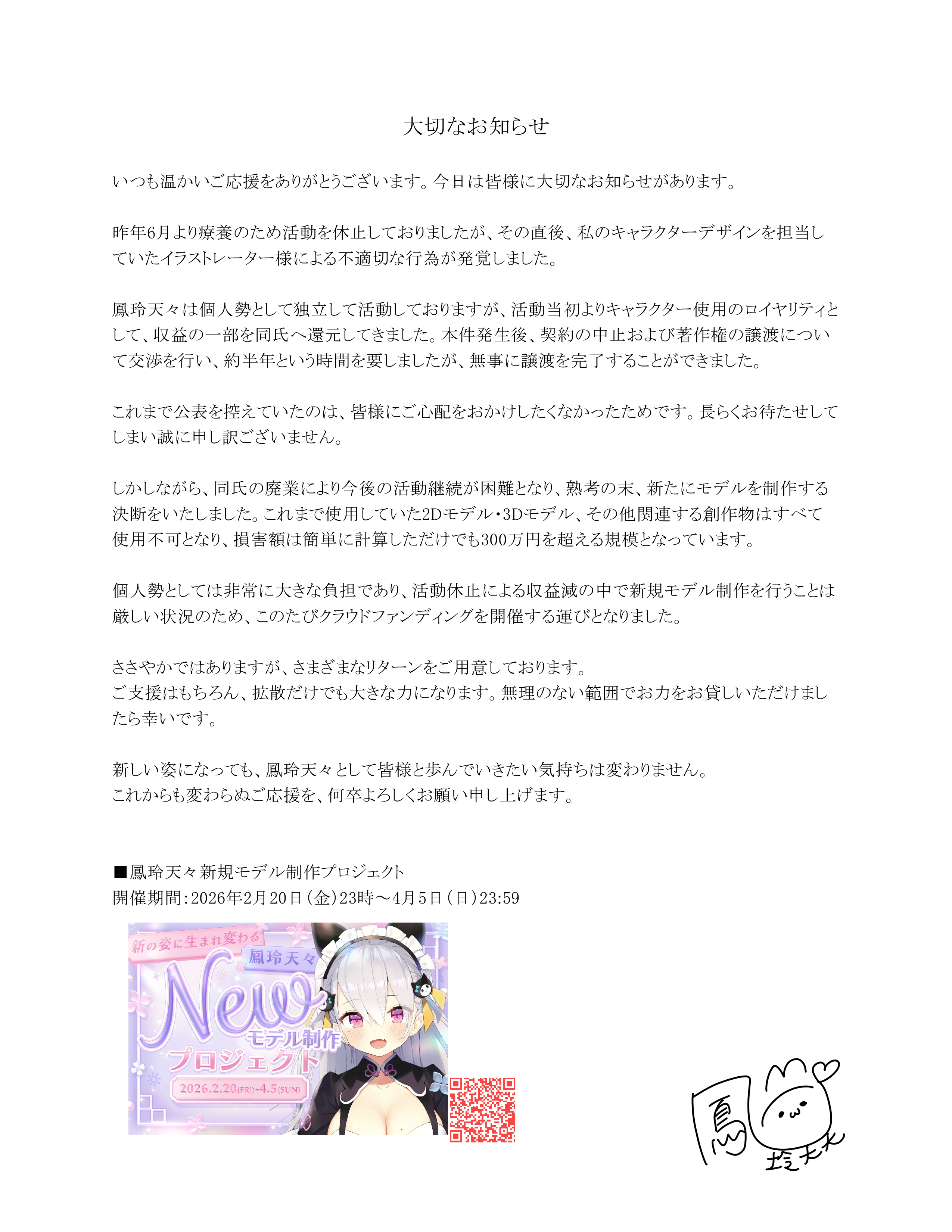 | … | 3026/02/08(日)12:32:21No.1399961679そうだねx5えー、また、この件に、えー、つきましてですね、これに関連すること、また、えー、もう、少しでも関係あることでもですね、えー、自分以外のライバーさんなどをはじめとした、えー、人々の、お名前を、出して、何かを論ずることは、えー、どうか、どうか、おやめいただくよう、謹んで、お願い申し上げます。 |