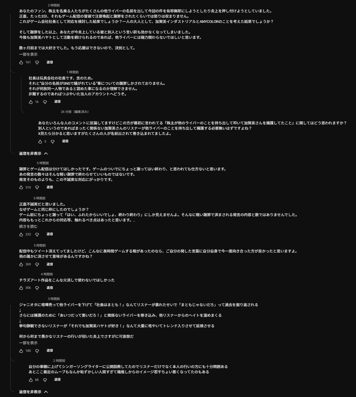 えー、まずは、そちらについて謝らせてください。えー、自分の周囲で、起こっていることで、ファンのみなさんや、他のライバーさんにも、えー、ご迷惑、そして、ご心配を、おかけいたしまして、本当に、申し訳ございませんでした。