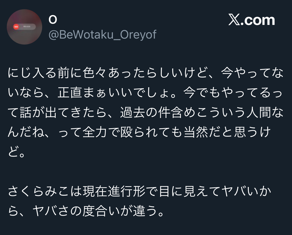 | … | 4526/02/08(日)14:52:17No.1400002581そうだねx3直近で言えばJRA案件とかデビとか栞葉みたいに外部の一般人相手に炎上したならともかく |