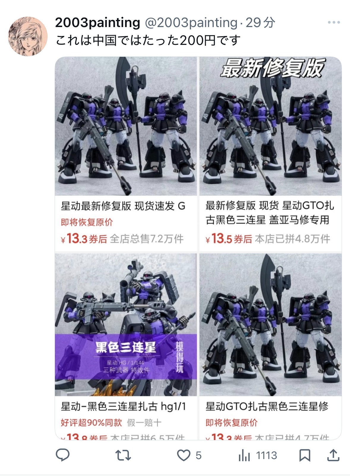| … | 3826/02/08(日)16:21:08No.1400029817+>>>まあ実際中国販売仕様ガンプラなんて知らんからわからんもんだな |