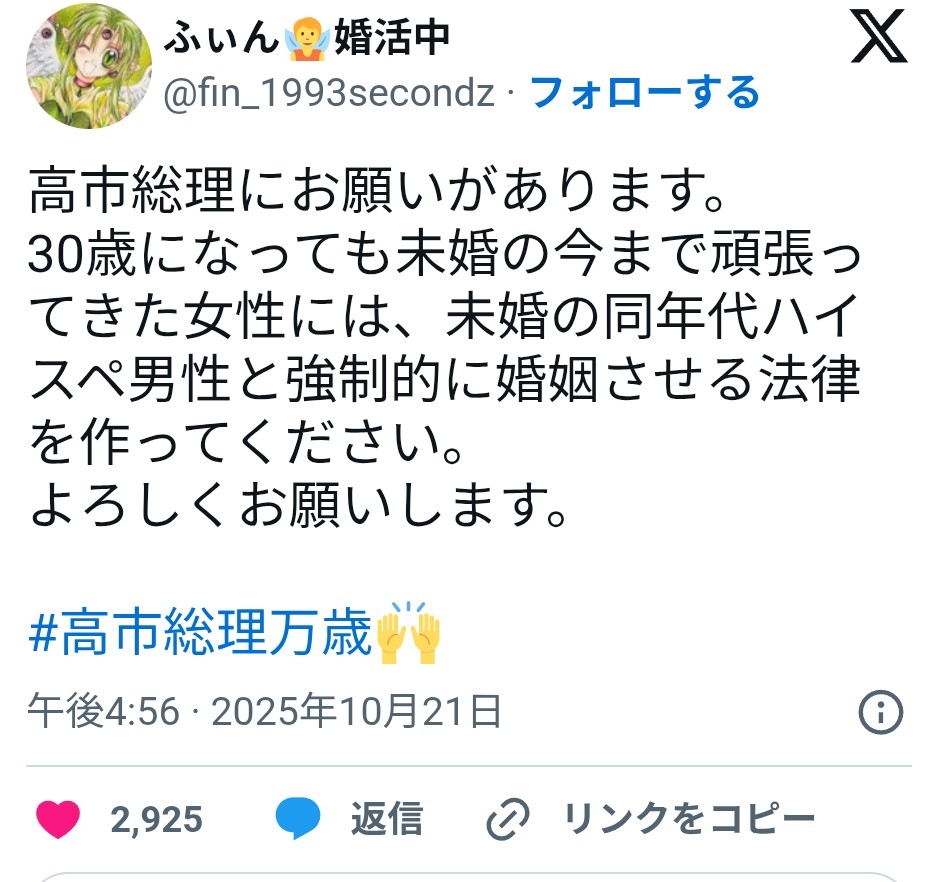 | … | 12526/02/08(日)22:26:26No.1400165469そうだねx3ハイスペ女性とは書かないの偉い!! |