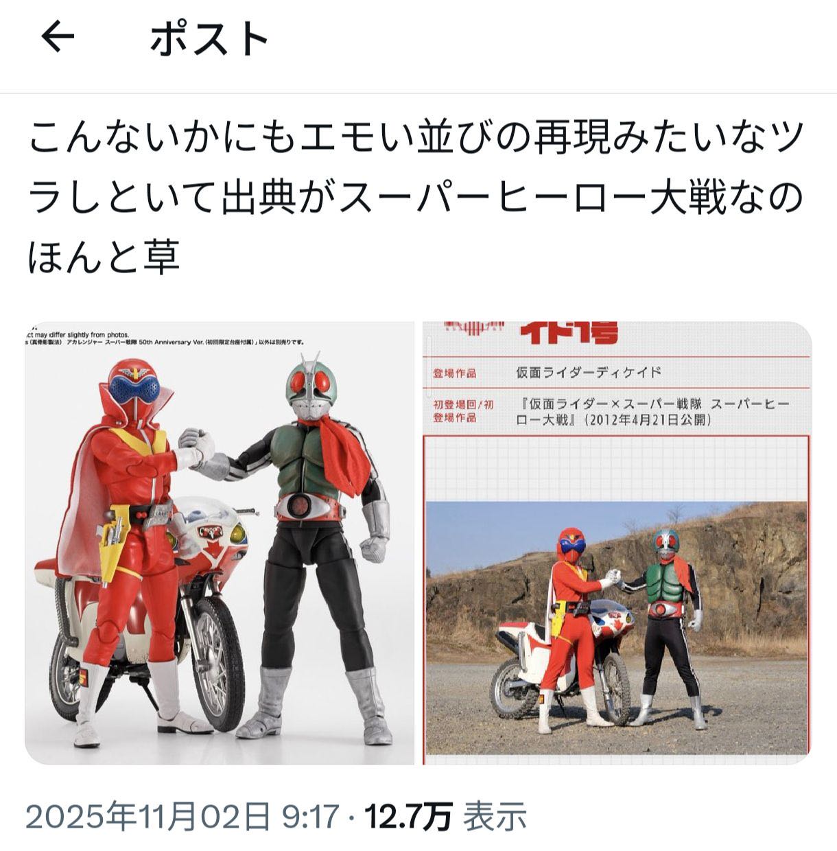 | … | 45926/02/09(月)21:45:02No.1400446869+>よく分からんがベルト見るにディケイドではなくね? |