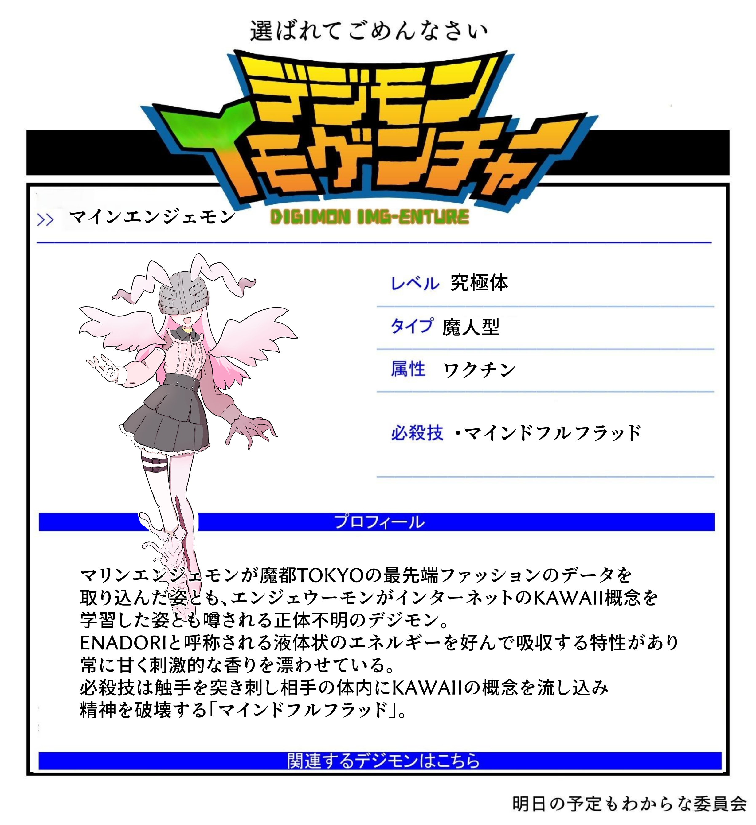 | … | 1826/02/10(火)05:50:08 ID:Zg9XwlUwNo.1400532345+お察しの通りマリンエンジェモンとマイン(地雷)の言葉遊びので地雷系という一発ネタです |