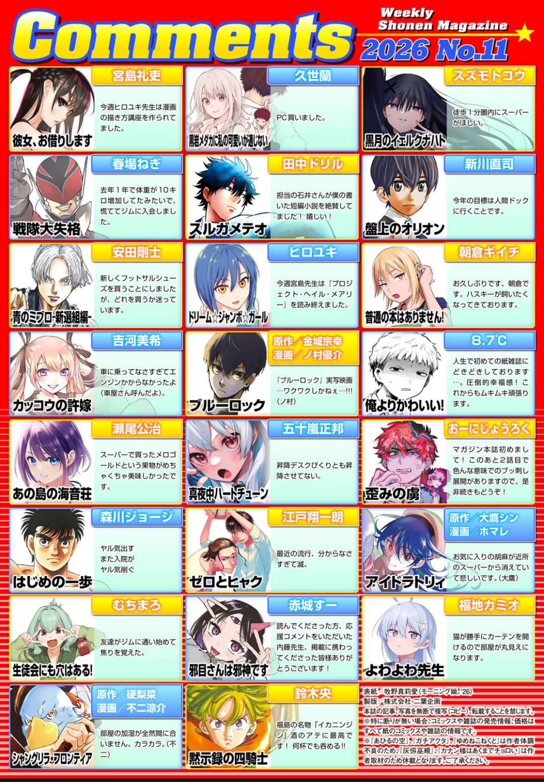 | … | 1026/02/10(火)01:23:13No.1400514895+連載作品は変われど10年20年誌面にいる作者多いなって感じなのはマガジンらしくはある |