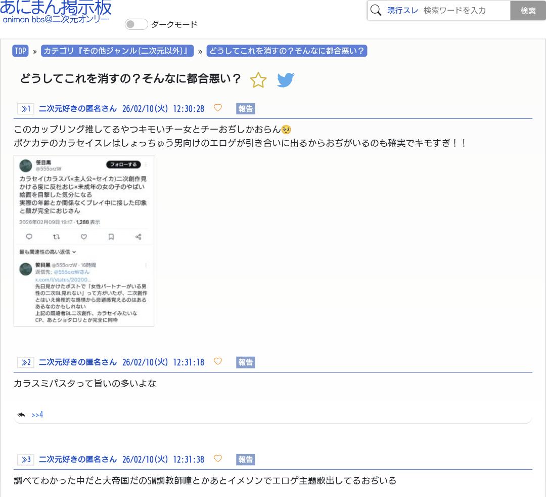 | … | 5026/02/10(火)14:07:30No.1400612498+ロリショタも禁止なんですか!? |