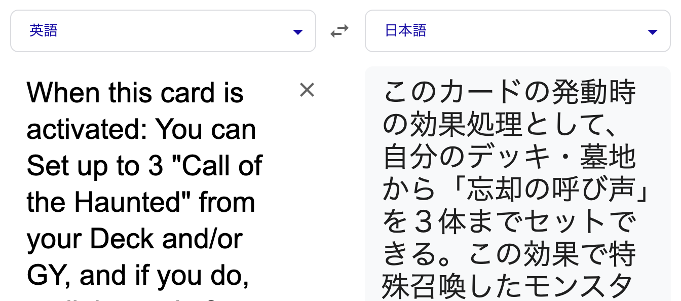| … | 13426/02/10(火)20:43:17No.1400719519そうだねx2Google翻訳に投げてたら「このカードの発動時の効果処理として」を完璧に訳してきてちょっと吹いた |