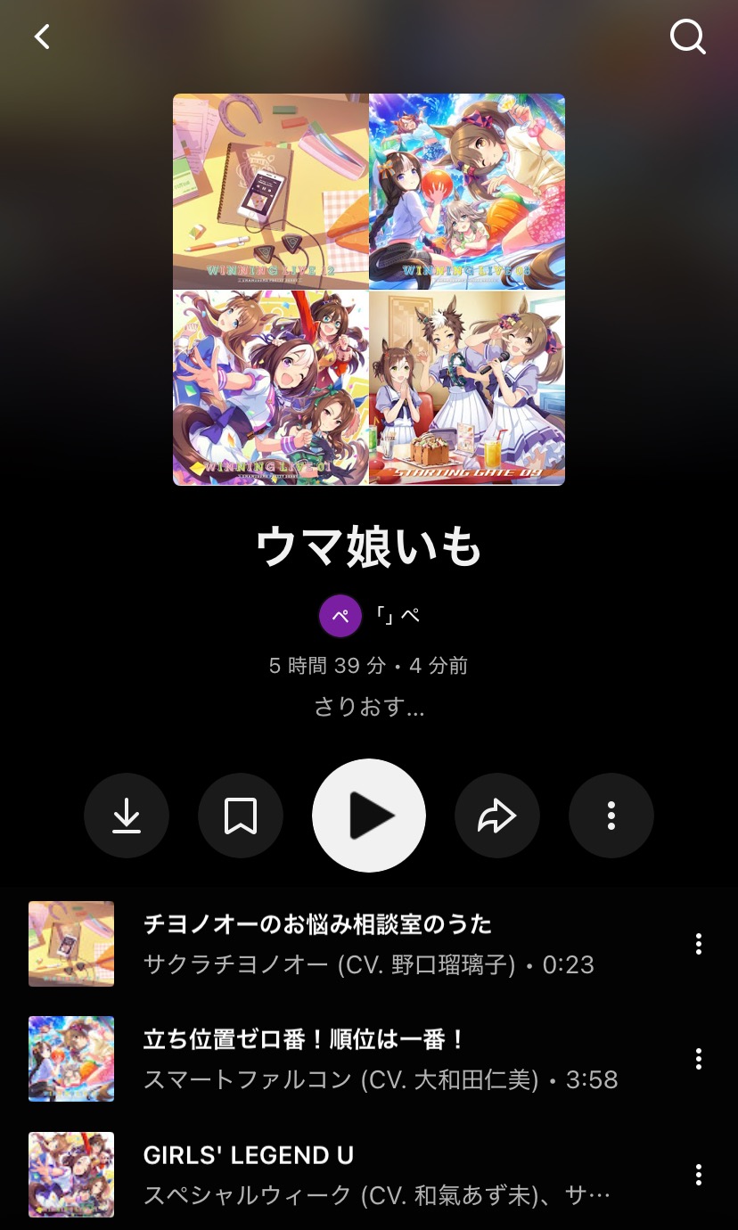 | … | 8726/02/10(火)20:49:15 ID:8Qalwyi2No.1400722047+>この前「」の好きなウマ娘楽曲でプレイリスト作ったんですが |