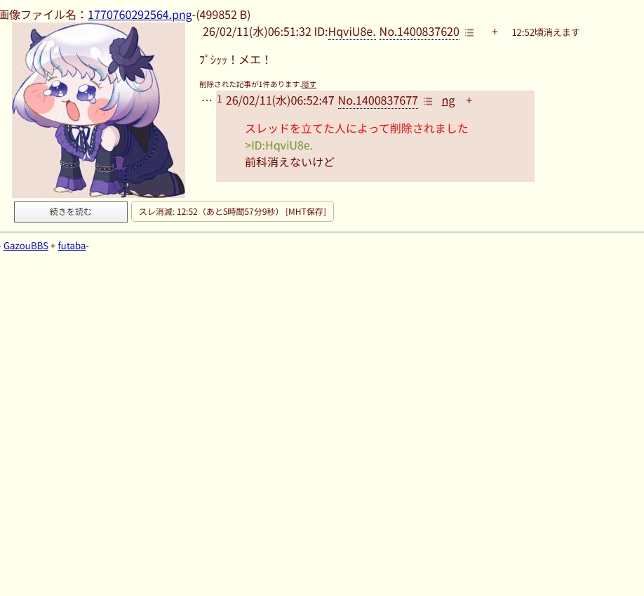 | … | 926/02/11(水)07:33:48No.1400840295+スレッドを立てた人によって削除されました |