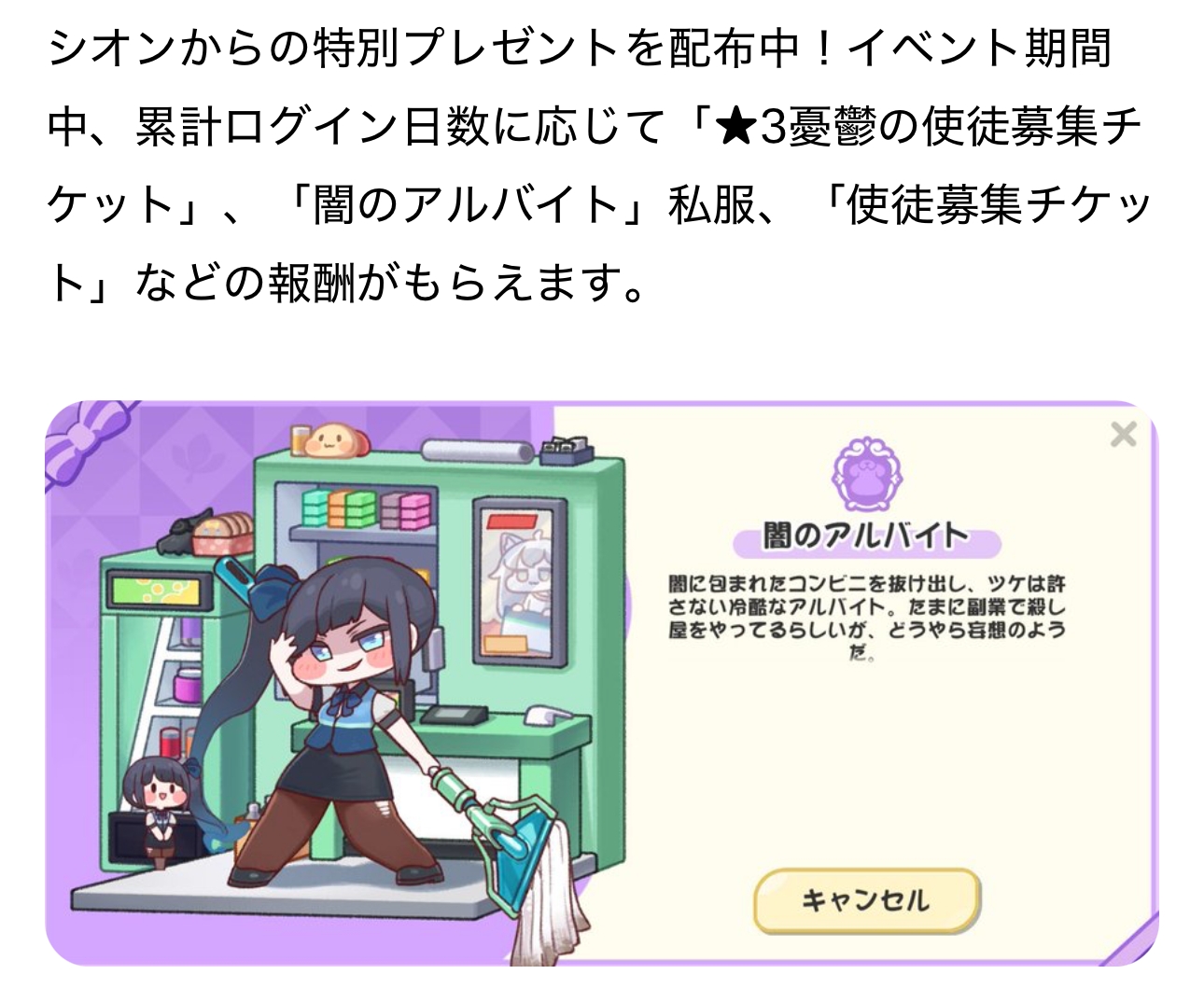| … | 6926/02/11(水)09:19:25 ID:OrTWNwHsNo.1400853883+バイトシオンのミニキャラ?のポーズがいらっしゃいませでかわいいにゃん… |