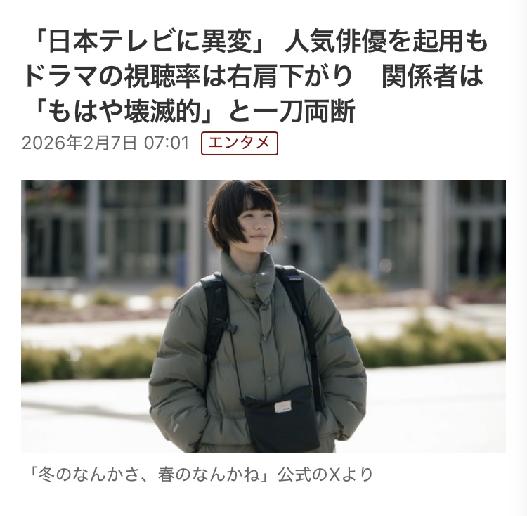 | … | 77026/02/11(水)10:51:14No.1400872607+年寄り多いんだからいくら面白かろうが若年層向けのドラマなんて視聴率伸びにくいんでしょ |