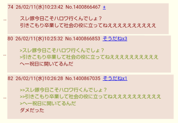 | … | 5826/02/11(水)13:17:10No.1400908506+いやでも俺も一瞬祝日にハロワって開いてるのか?と思っちゃったよ |