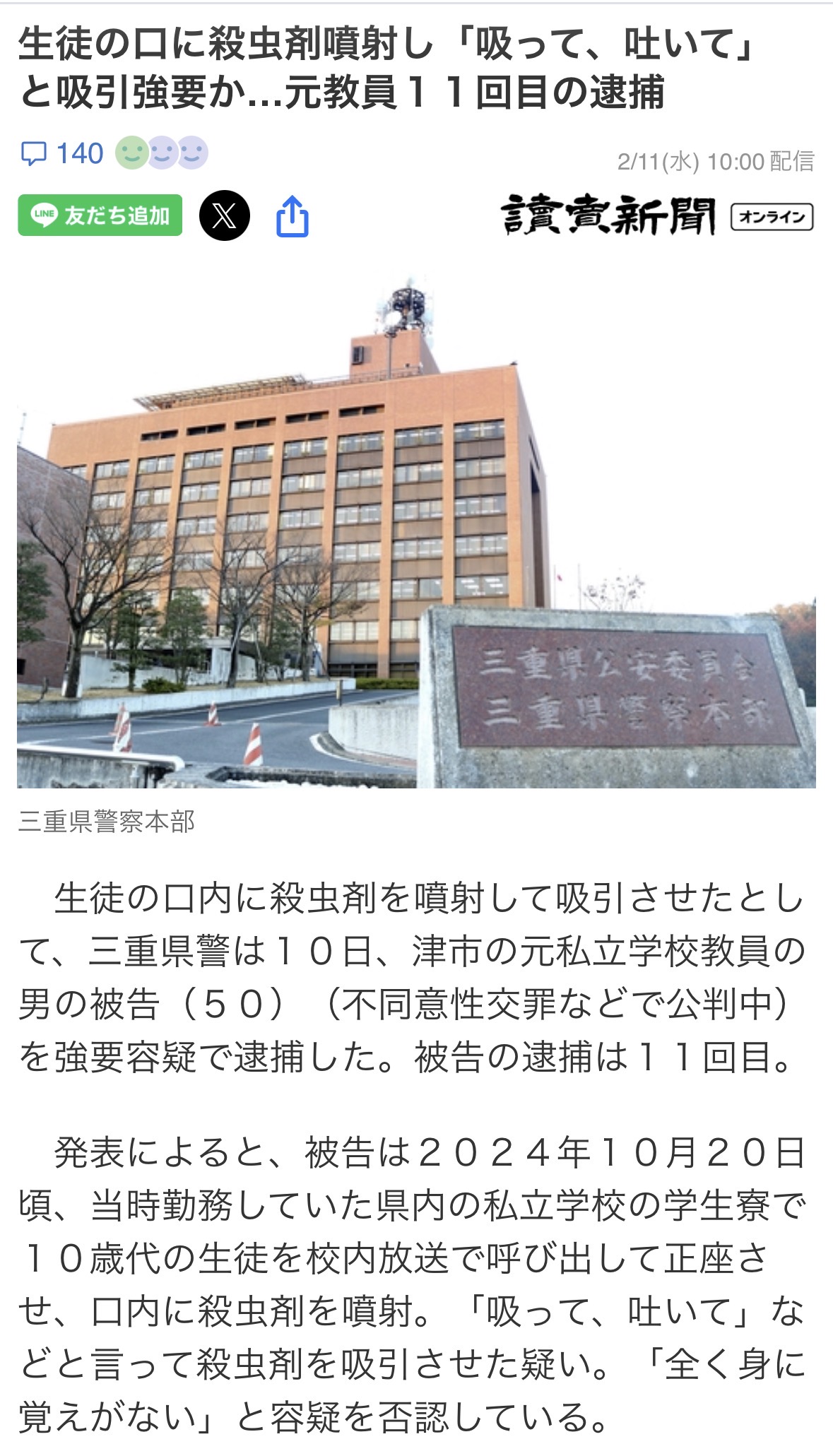 | … | 9626/02/11(水)14:56:40No.1400932207+>高木容疑者は昨年2月以降、生徒ら11人に対する不同意性交や不同意わいせつ容疑などで10回逮捕されていた。これまでに開かれた公判で「事実無根」として無罪を主張している。 |