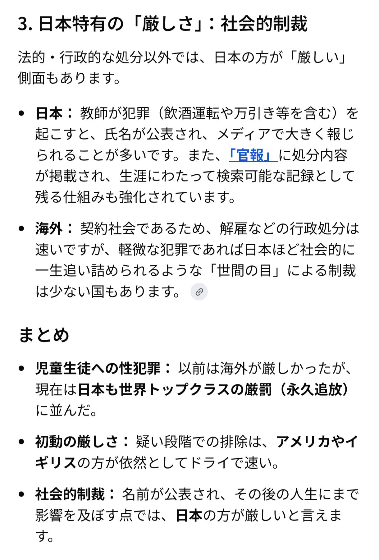 | … | 15226/02/11(水)15:18:35No.1400937484そうだねx1日本は〜って言われてムカつくのは分かるけど先進国海外の方が教員の犯罪に関する制度は厳しくね? |