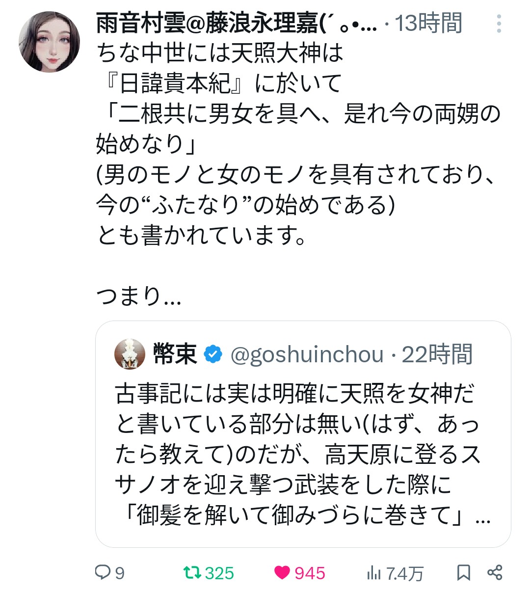 | … | 2326/02/11(水)20:07:22No.1401017562+>古事記に元明天皇が関わってて女性天皇の正当性を示すために天照を女神したって説もなかったっけ |
