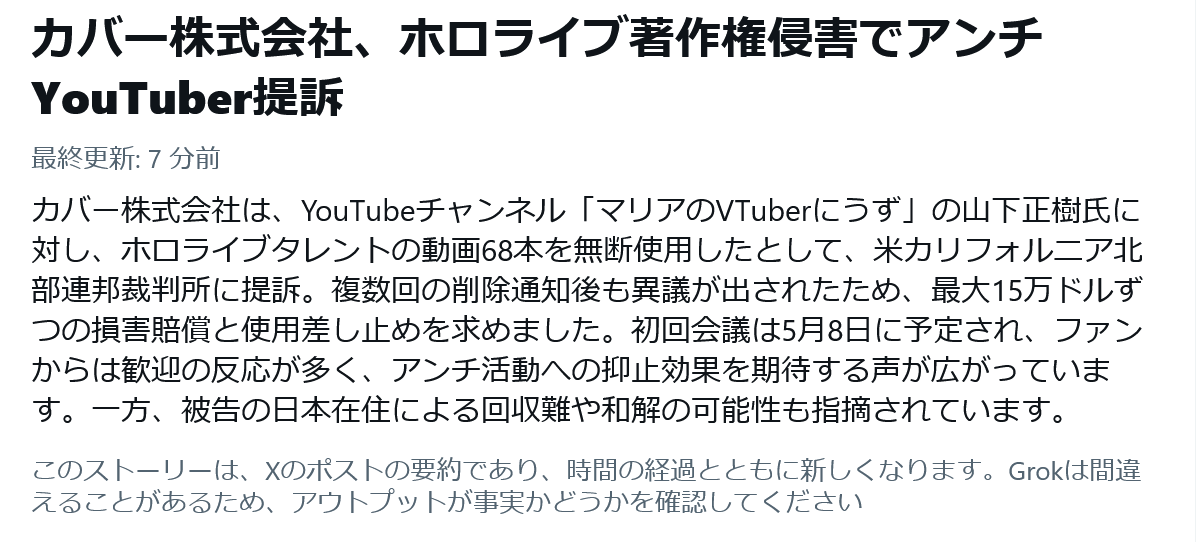 | … | 1726/02/11(水)21:32:08 ID:CXDaa9q.No.1401050973+>- 被告がYouTubeチャンネルに68本の侵害動画をアップロードし、20人のCoverキャラクターを無断使用したと主張し、カリフォルニア北部地区連邦地裁に提訴。👨⚖️ |