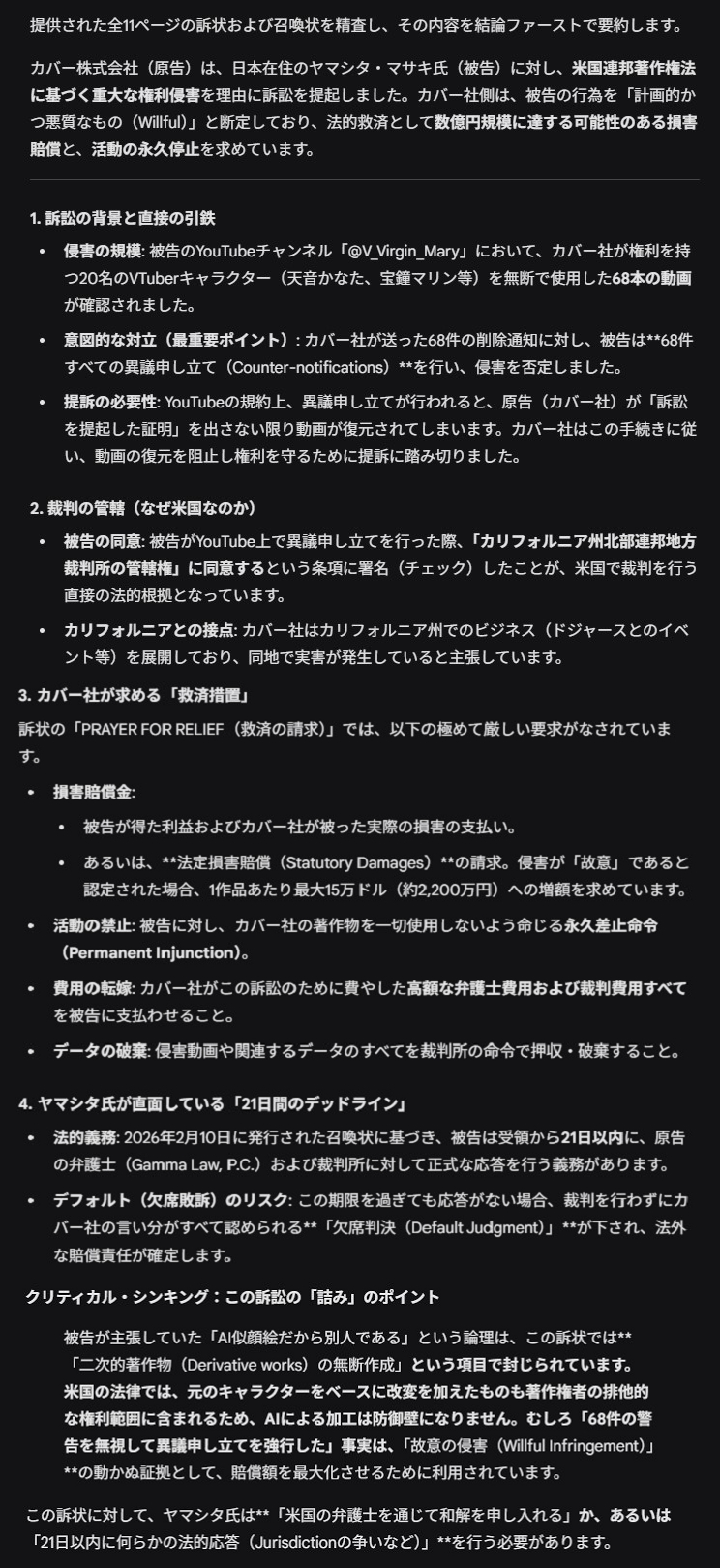 | … | 4526/02/12(木)00:29:40No.1401114929そうだねx1訴訟大国アメリカでの裁判かぁ〜 |