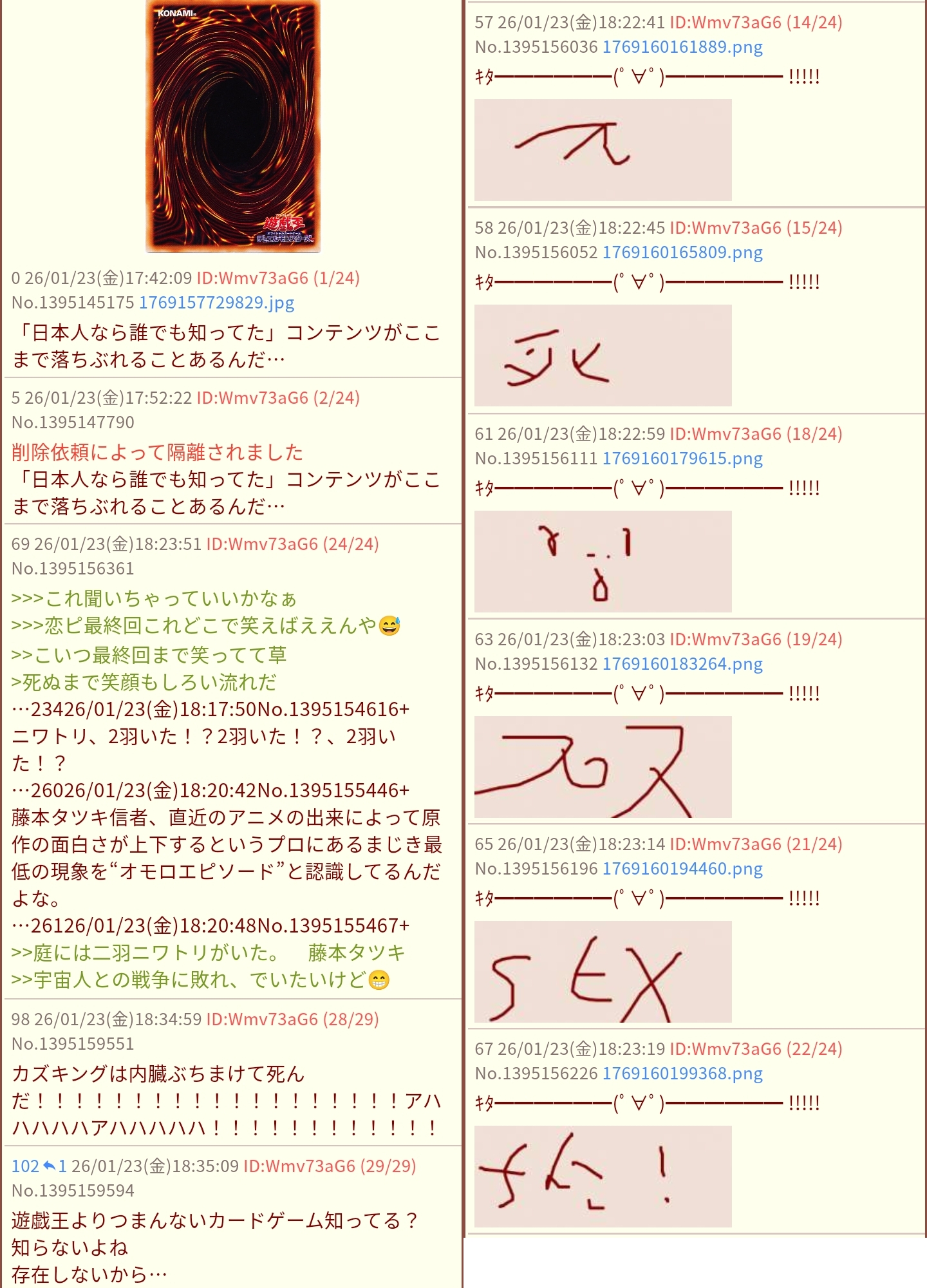 | … | 16226/02/12(木)09:29:20No.1401171119+少なくとも遊戯王とデュエマとVとウマ娘とブルアカとアズレンと艦これに対する粘着は100%同一 |