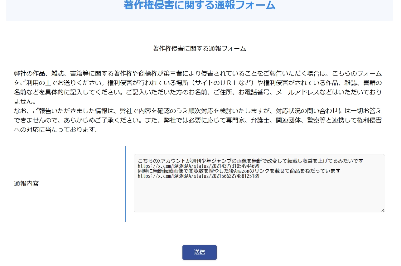 | … | 5826/02/12(木)06:33:38No.1401151207そうだねx3とりあえずこのアカウントを集英社に通報して漫画の画像の転載で利益あげてますよって言っておこう |