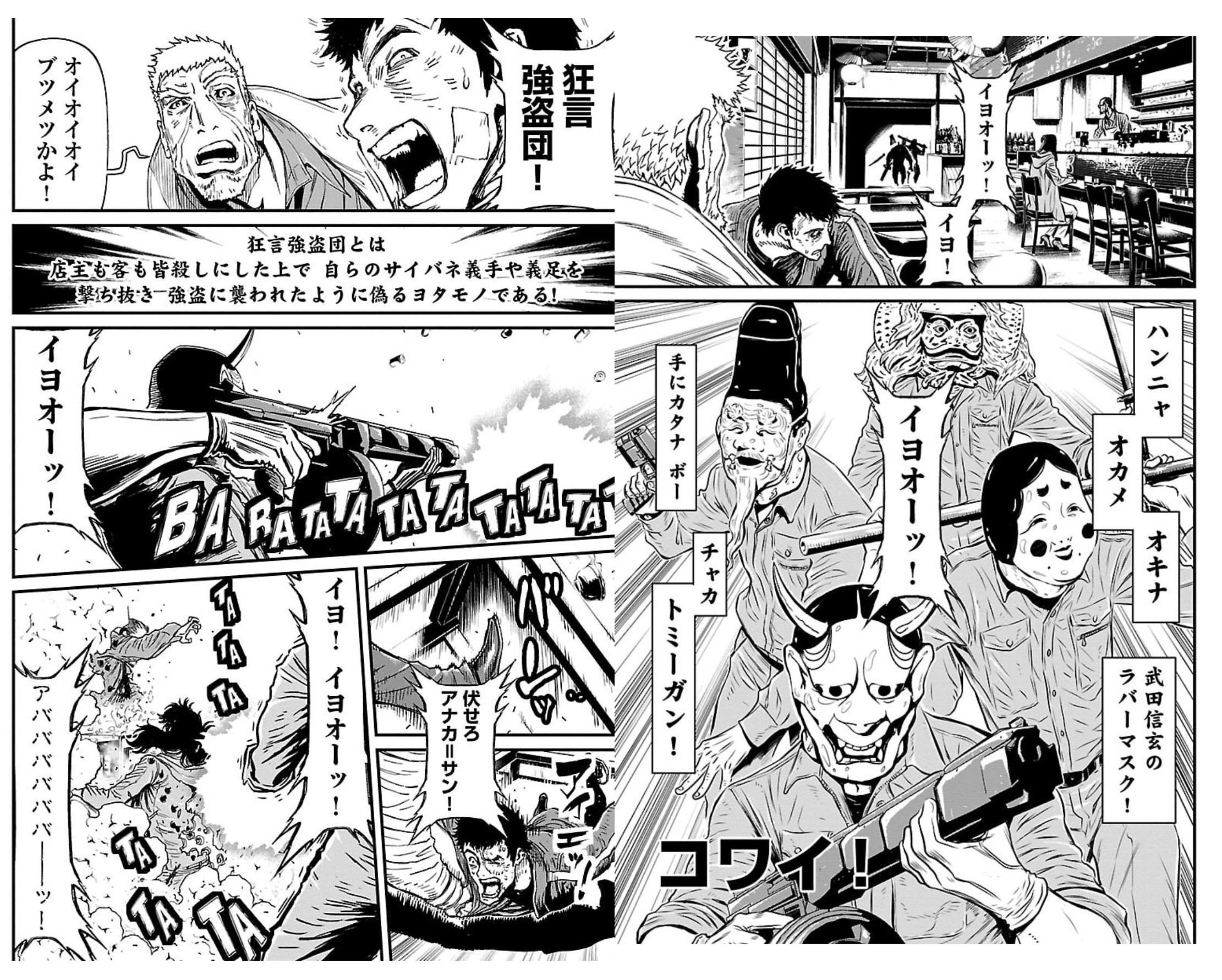>「イヨオーッ!」「イヨ!イヨオーッ!」「イヨオーッ!」奇声を上げる5人組は、黒いツナギを着て、オキナやオカメや武田信玄のラバーマスクを被り、手には機関銃やカタナを持っていた!そして何の警告もないまま発砲!「グワーッ狂言強盗団!」ガンドーは紙一重の横っ飛びで回避し、二丁拳銃を抜く!