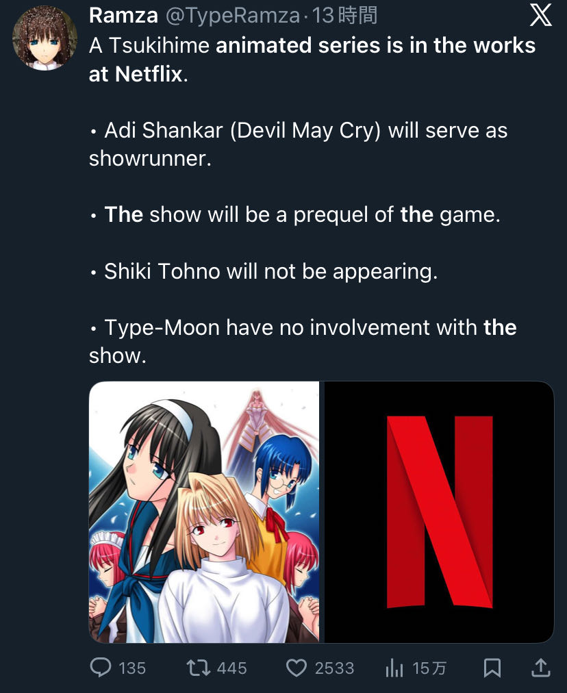 | … | 626/02/12(木)12:38:40No.1401211434+昨日も型月が関与していない月姫前日譚(原作キャラ登場なし)のネトフリアニメのリークスレ立ってたな… |