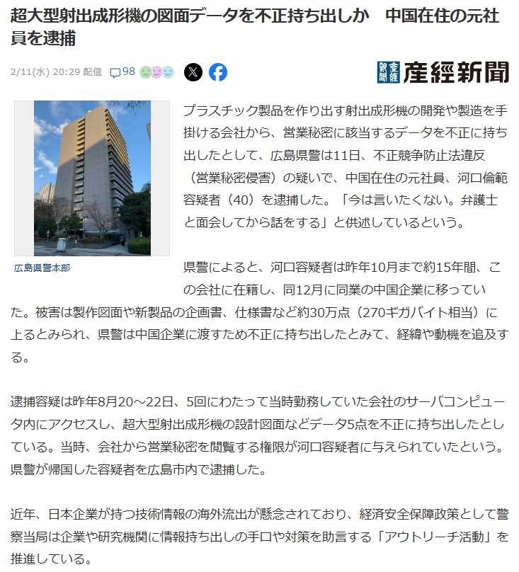 | … | 526/02/12(木)20:51:47No.1401349457そうだねx5前月は工作機械メーカーでロシアスパイが逮捕されてた |