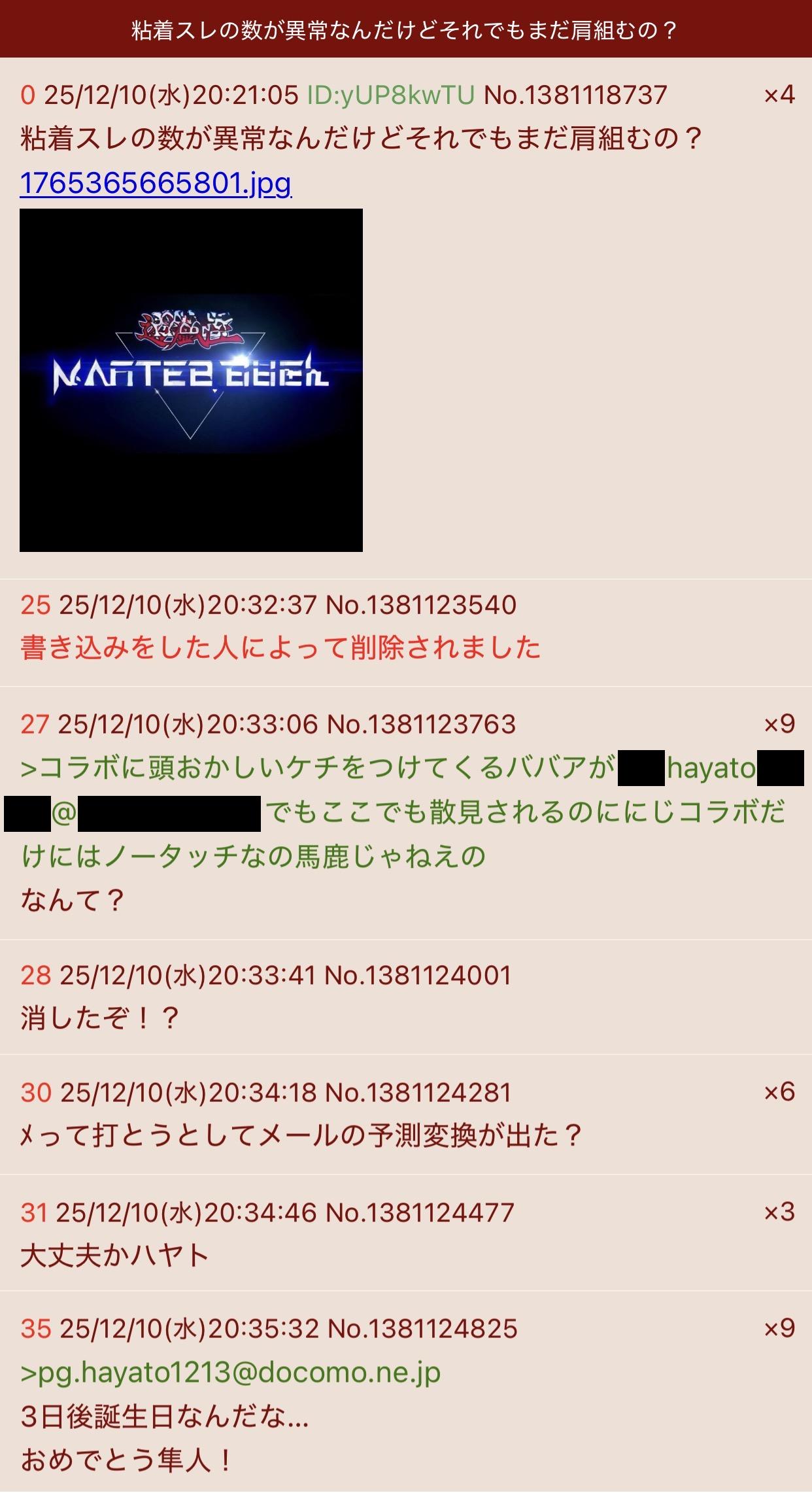 | … | 48126/02/12(木)23:10:38No.1401404536そうだねx1わかりました…hayato1213は架空のアドレスだと認めます… |