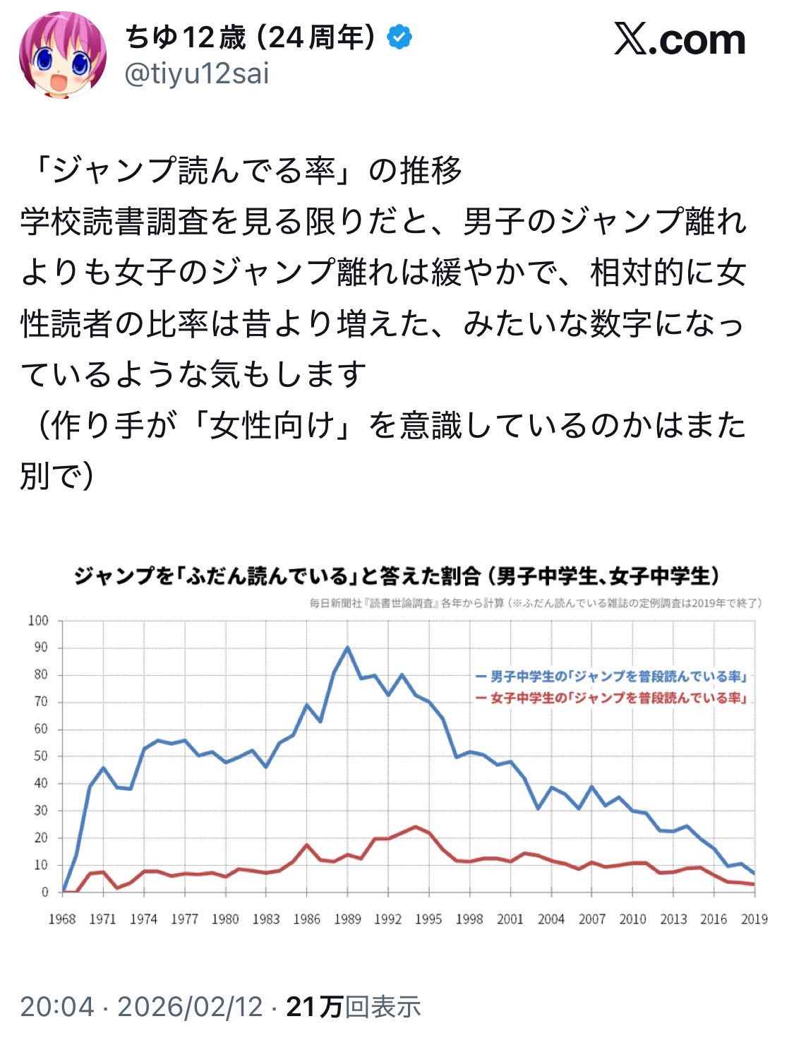 | … | 5126/02/12(木)23:46:54No.1401416431そうだねx5>読者の男女比変わってないって必死に言ってるやつ結構見かけたけどやっぱ相対的に女子率高くなってんじゃん |