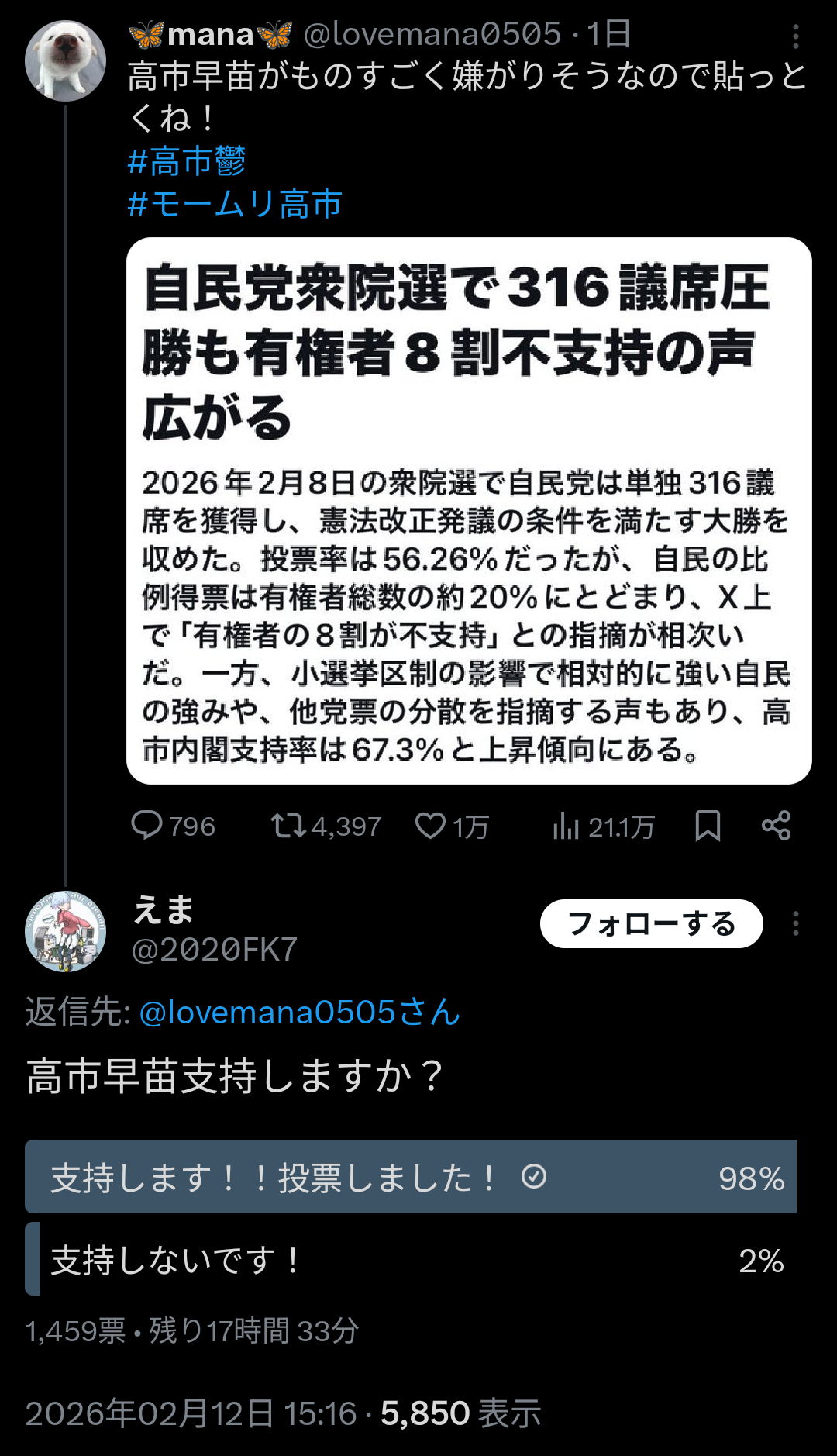 | … | 1026/02/13(金)03:00:31No.1401453508+こういう有権者の8割が不支持って自分が支持する政党はそれ以上に不支持の割合が高かったって考えに至らないのな… |